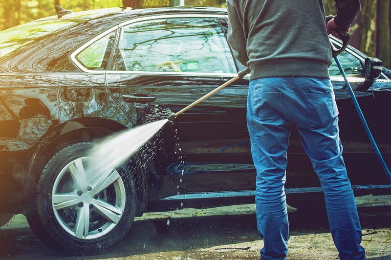 2. Rinse: Rinse the car thoroughly using a hose or pressure washer, starting from the top and working your way down.